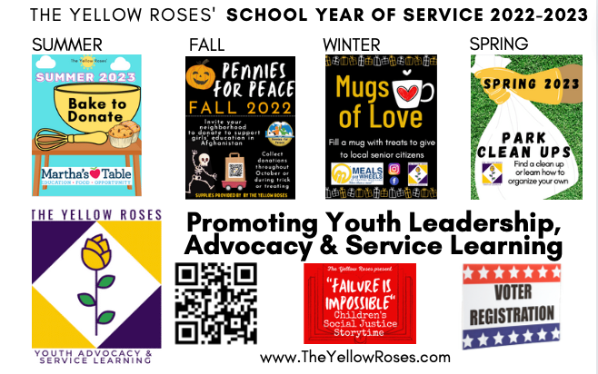 We are a youth-led group that seeks to empower youth through service learning and advocacy. Each year we do a School Year of Service to help bring our community together in service activities. You can contact us by email at TheYellowRoses2020@gmail.com . Check out our social media accounts on Instagram and Facebook @theyellowrosesofficial